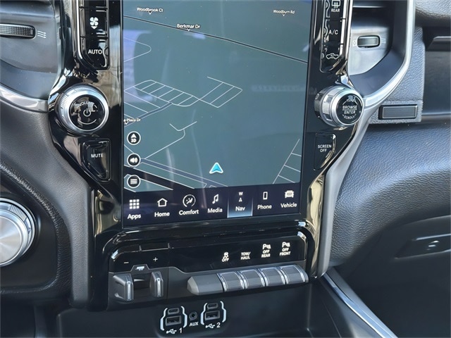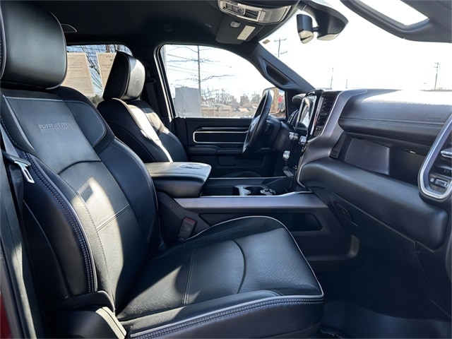 Heavy Duty Snow Plow Prep Group (220 Amp Alternator), Laramie Level An Equipment Group (2nd Row In Floor Storage Bins, Auto High Beam Headlamp Control, Chrome Exterior Mirrors, Exterior Mirrors Courtesy Lamps, Exterior Mirrors w/Heating Element, Exterior Mirrors w/Memory, Exterior Mirrors w/Supplemental Signals, Foam Bottle Insert (Door Trim Panel), Mirror Running Lights, Mirror-Mounted Aux Reverse Lamps, Power Adjustable Convex Aux Mirrors, Power Adjustable Pedals w/Memory, Power Chrome Tow Mirrors w/Convex Spotter & Memory, Power Folding Mirrors, Radio/Driver Seat/Mirrors/Pedals Memory, Rain Sensitive Windshield Wipers, Remote Tailgate Release, and Trailer Tow Mirrors), Off Road Package (Front Performance Tuned Shock Absorbers, Hill Descent Control, Off Road Decal, Rear Performance Tuned Shock Absorbers, and Tow Hooks), Quick Order Package 2GH Laramie, Sport Appearance Package (Black Interior Accents, Body Color Door Handles, Body Color Grille Surround, Painted Front Bumper, Painted Rear Bumper, and Sport Decal), Front dual zone A/C, 10 Speakers, 115V Auxiliary Rear Power Outlet, 12" Touchscreen Display, 2 Way Rear Headrest Seat, 3.73 Axle Ratio, 4 Way Front Headrests, 4-Wheel Disc Brakes, 4G LTE Wi-Fi Hot Spot, 5th Wheel/Gooseneck Towing Prep Group, 8.4" Touchscreen Display, ABS brakes, Active Noise Control System, Adaptive Steering System, Adjustable pedals, Air Conditioning, Alexa Built-In, All R1 High Radios, All Radio Equipped Vehicles, Alloy wheels, AM/FM radio: SiriusXM, Anti-Spin Differential Rear Axle, Apple CarPlay, Apple CarPlay/Android Auto, Auto-dimming Rear-View mirror, Automatic temperature control, Bluetooth Handsfree Phone & Audio, Brake assist, Bumpers: chrome, Clearance Lamps, Compass, Connected Travel & Traffic Services, Connectivity - US/Canada, Delay-off headlights, Disassociated Touchscreen Display, Driver door bin, Driver vanity mirror, Dual front impact airbags, Dual front side impact airbags, Electronic Stability Control, Electronically Controlled Throttle, For Details, Visit DriveUconnect.com, For More Info, Call 800-643-2112, Front anti-roll bar, Front Center Armrest w/Storage, Front fog lights, Front License Plate Bracket, Front reading lights, Front Seat Back Map Pockets, Fully automatic headlights, Garage door transmitter, Global Telematics Box Module (TBM), Google Android Auto, GPS Antenna Input, GPS Navigation, HD Radio, Heated door mirrors, Heated Front Seats, Heated front seats, Heated Steering Wheel, Heated steering wheel, Illuminated entry, Integrated Center Stack Radio, Integrated Voice Command w/Bluetooth, Leather steering wheel, Leather Trim 40/20/40 Bench Seat, Low tire pressure warning, MOPAR Spray In Bedliner, Occupant sensing airbag, Off-Road Information Pages, Outside temperature display, Overhead airbag, Overhead console